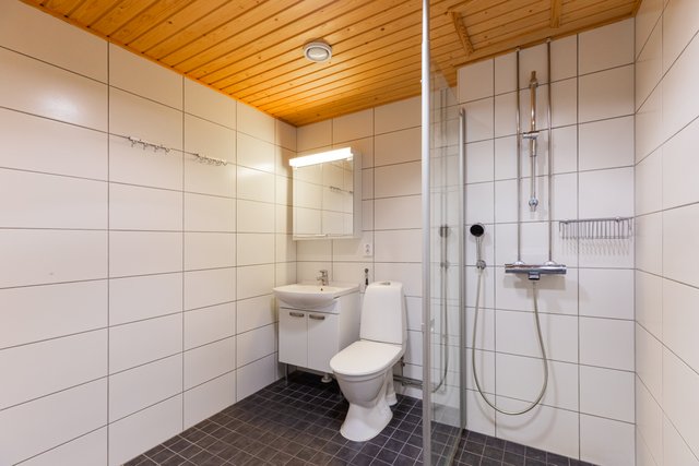 - WC-istuin, suihku, suihkuseinä, pesukoneliitäntä, lattialämmitys, peilikaappi, pesuallas, allaskaappi, bidee-suihku, ja pyykkikaappi