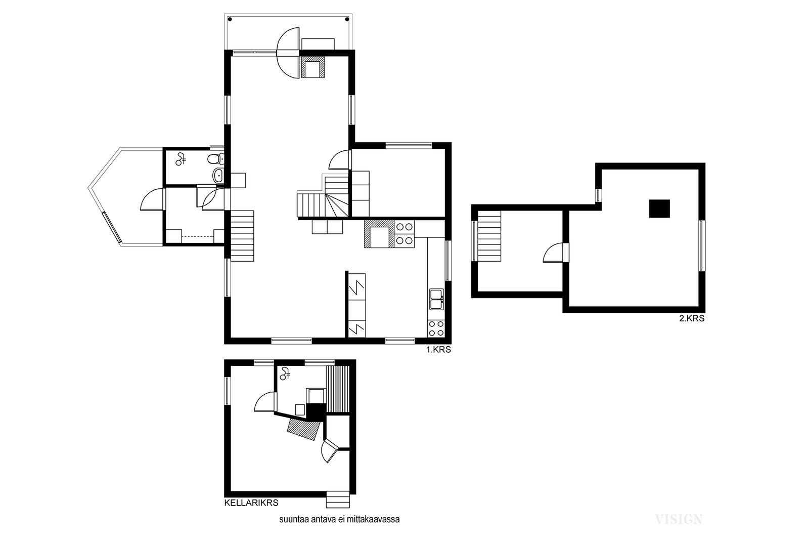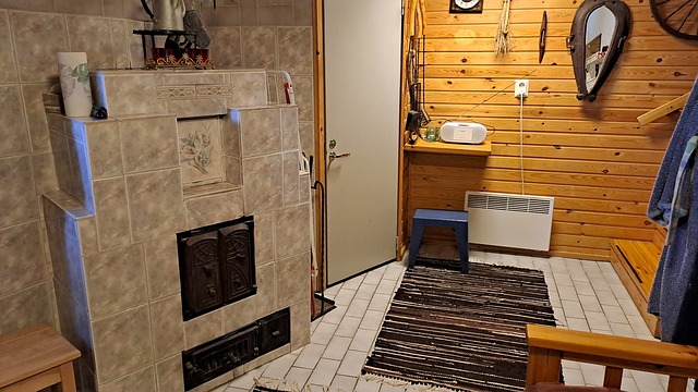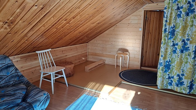 Talon asuinkerroksessa on iso olohuone, jonka ikkunat avautuvat niin piha puolelle kuin järvelle, keittiö ja makuuhuone, wc sekä suihku. Leivinuunit, ja hella antavat puulämmittäjälle lämpöä pattereiden ja ilmalämpöpumpun lisäksi. Yläkerran tilaa nukkumiseen tai säilyttämiseen. Kellari kerroksessa on takka/pukuhuone sekä sauna.