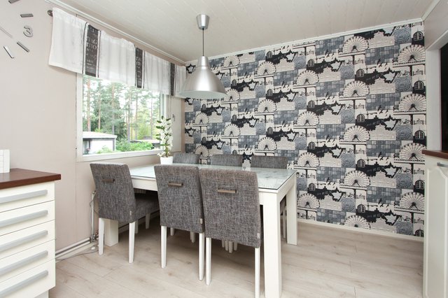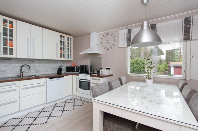 - Kaapistot (Ikea), astianpesukone, jääkaappi, keraaminen liesi/uuni ja liesituuletin. Keittiö remontoitu v. 2010. Lattia: vinyyli, seinät: tapetti, välitilassa lasi.