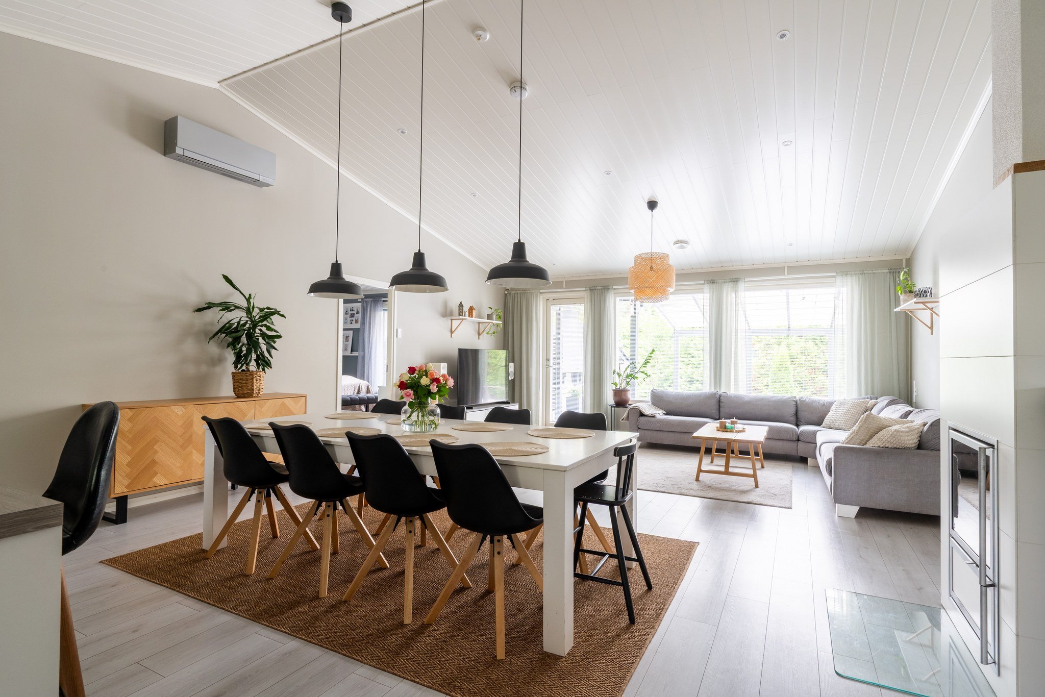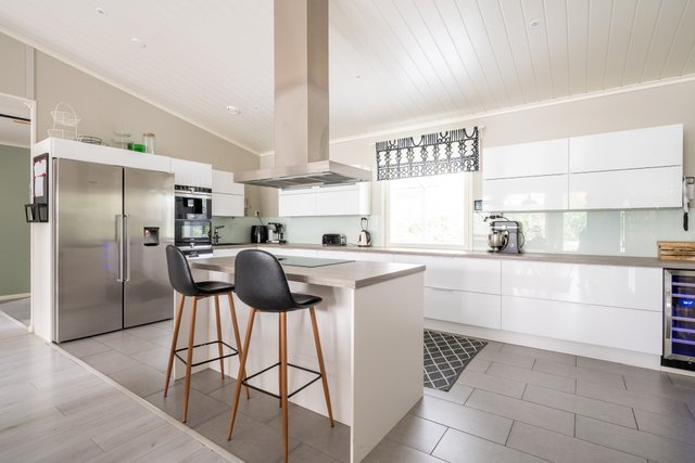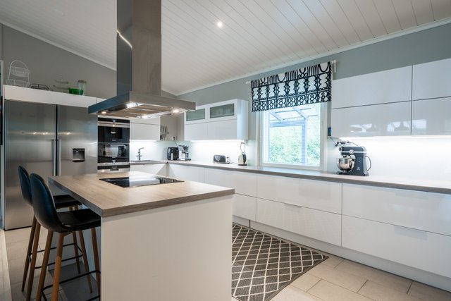 - Tyylikäs ja hyvinvarusteltu avokeittiö on yhtenäistä tilaa olohuoneen ja ruokailutilan kanssa. Lisää avaruutta suureen ja näyttävään tilaan tuo ylösnostettu katto.