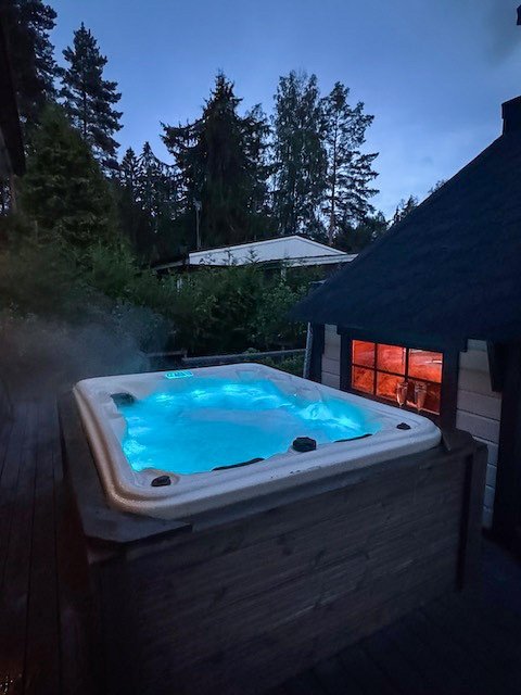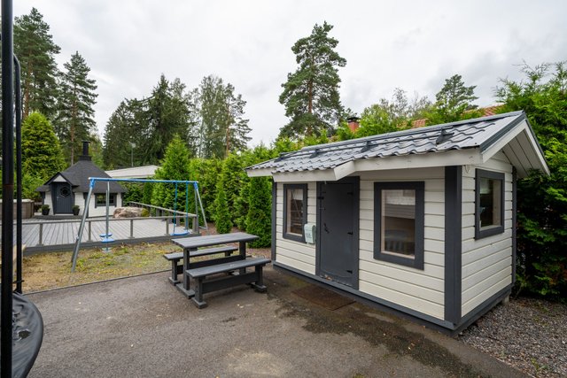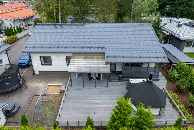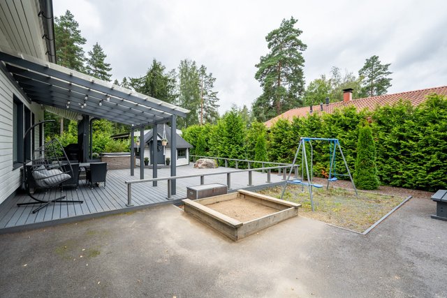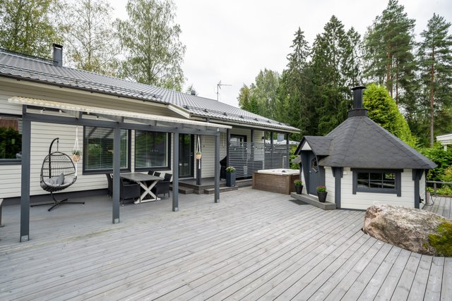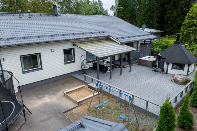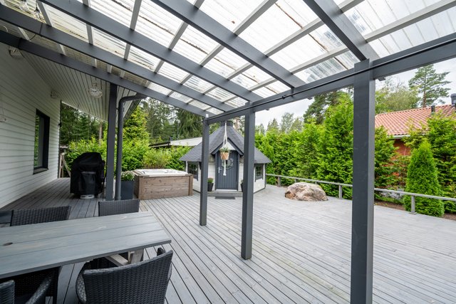 - Kodin länsipihalla on suuri trassialue, josta osa on katettu. Terassin yhteydestä löytyy tunnemallinen grillikota, jossa on mukava viettää aikaa musiikkia kuunnellen ja tulistellen joko isomalla tai pienemmällä porukalla. Vuoden aikojen vaihtelua voit tällä terassilla ihailla myös ulkoporeammeen lämmössä.