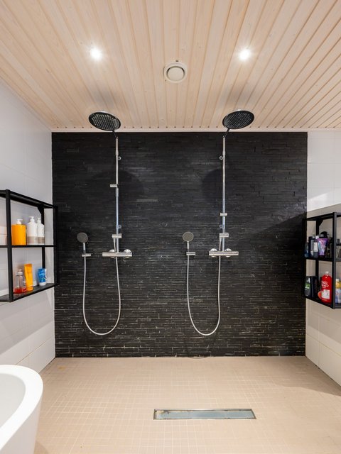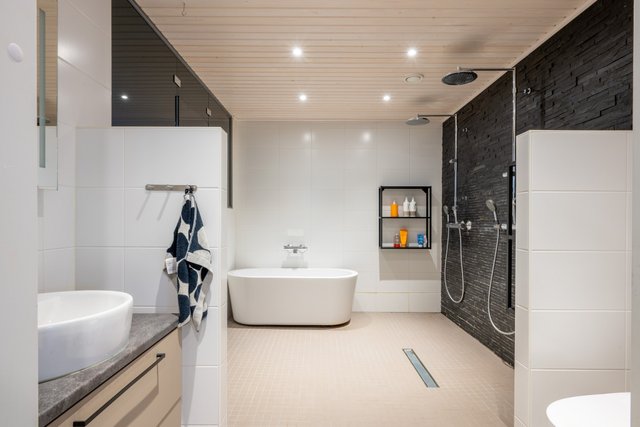 - Upea moderni kylpyhuone on varustettu kahdella sadesuihkulla, sekä kauniilla ovaalin muotoisella kylpyammella. Lisäksi kylpyhuoneen yhteydessä on väliseinillä erotettu wc-tila, sekä käsienpesuallas kalusteineen.
