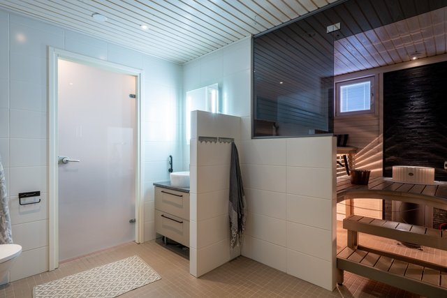 Talo tarjoaa viisi makuuhuonetta, joista yksi toimii tällä hetkellä työhuoneena. Moderni kylpyhuone kahdella sadesuihkulla ja tyylikäs kylpyamme tuovat arkeen ripauksen luksusta. Lisäksi kodista löytyvät erillinen wc ja tilava sauna, jossa viihtyy isompikin seurue.