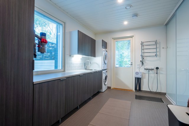 - Arjen sujuvuuden takaa kodinhoitohuone, josta on käynti suoraan ulos ja ulko-oven vierestä löytyy kurapiste, mikä on melkoinen bonus niin lapsiperheelle, kuin koirien kuratassuillekin. Pyykkihuoltoa helpottaa runsaat kaappi- ja laskutilat.