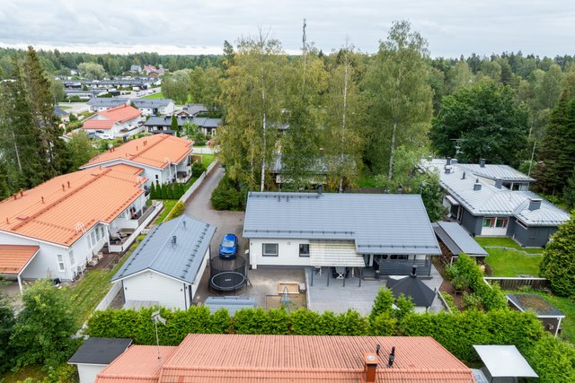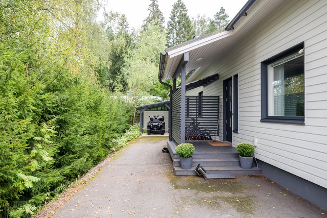 Piha on suunniteltu helppohoitoiseksi: kulkuväylät on asfaltoitu ja takapihalla on laaja terassialue. Käytännöllisyyttä lisäävät tilava ja korkea autotalli, erillinen varastotila ja ulkovarasto, jotka tarjoavat runsaasti säilytys- ja harrastemahdollisuuksia.