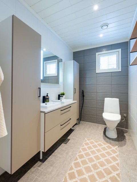 - Talon toisesta päästä löytyy tilava erillinen WC, jossa on runsaasti säilytystilaa ja kaksi pesuallasta. Toinen wc on saunaosaston yhteydessä ja kolmas wc löytyy autotallista.