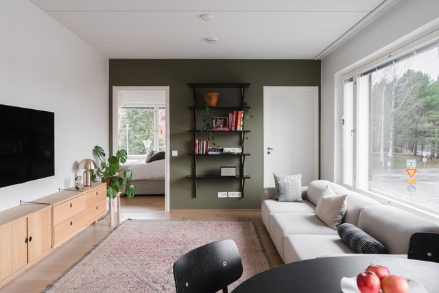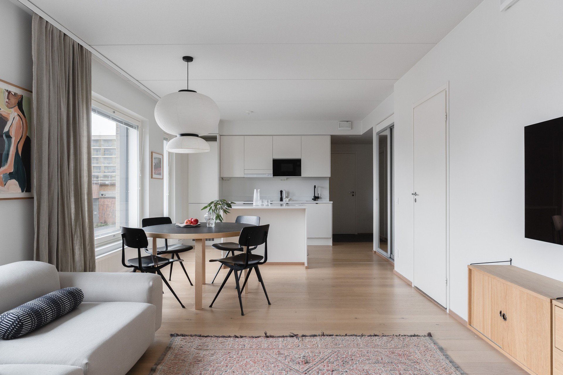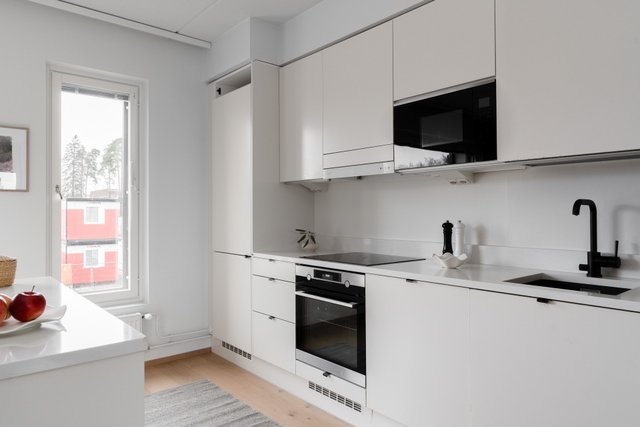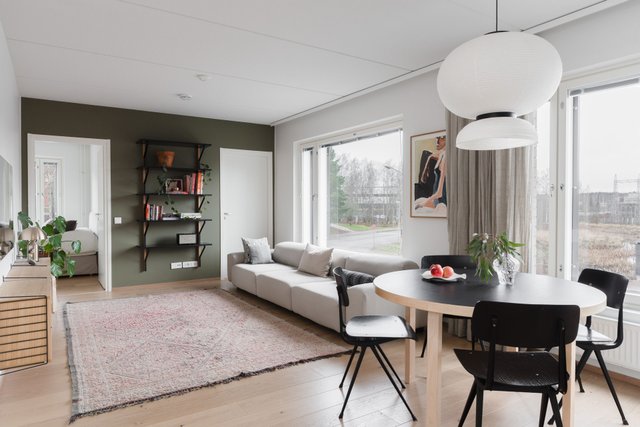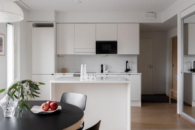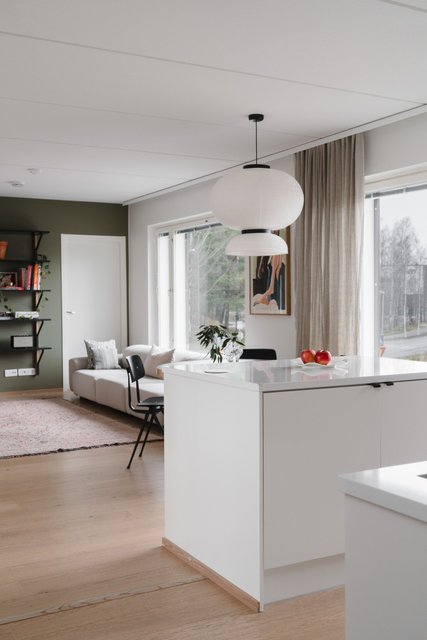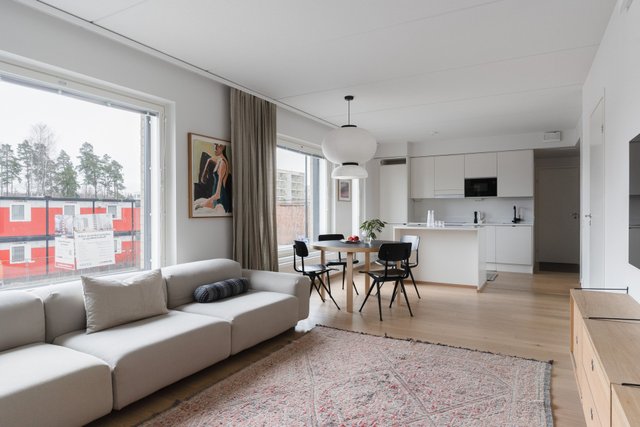 Suuret ikkunat kehystävät oleskelutilaa kauniisti ja korostavat avaran pohjaratkaisun ilmavuutta. Avokeittiö yhdistyy saumattomasti ruokailu- ja olohuoneeseen. Modernit vaaleat pinnat, saareke sekä laadukkaat kalusteet luovat kokonaisuudesta tyylikkään ja käytännöllisen. Näissä tiloissa arjen rytmi kulkee kevyesti. Kokkailun lomassa vaihdetaan päivän kuulumiset ja auringon valo osuu juuri oikealla tavalla asuntoon.