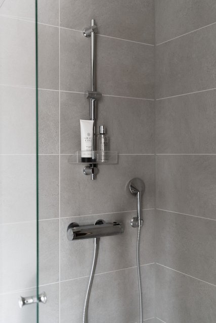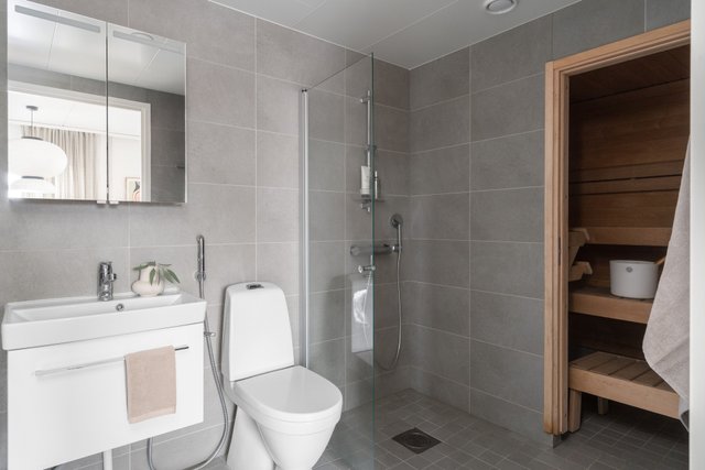 Kodin kylpyhuone on moderni ja harmoninen kokonaisuus. Kauniit harmaat laatat, selkeälinjaiset kalusteet ja toimiva pohja tekevät rutiineista miellyttäviä. Oman saunan lämpö kutsuu rentoutumaan ja erillinen wc helpottaa arkea isommankin perheen kanssa.