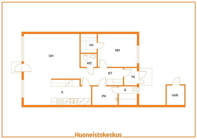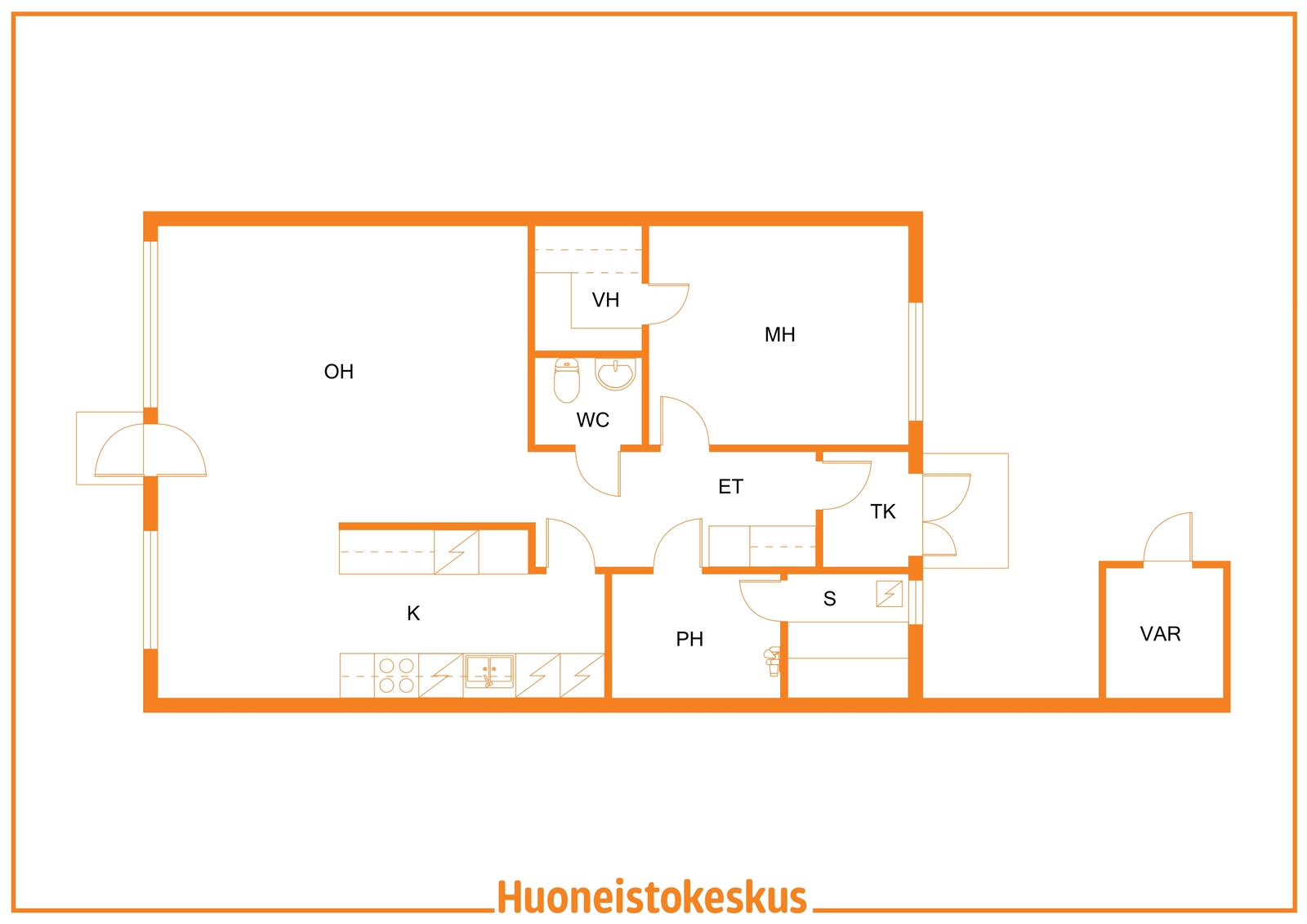 2 h, k, rt, s, kh, wc, vh, terassi, ulkovarasto (yj:n mukaan 2h+k+s+ulkova r.)