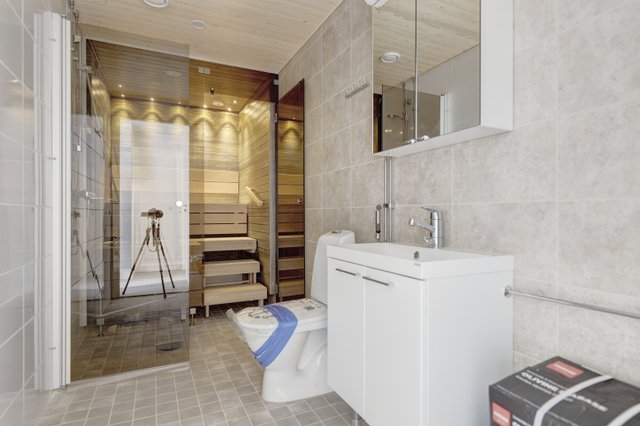 - Suihku, suihkuseinä, wc-istuin, pesuallas, allaskaappi, peili tai peilikaappi, bidee-suihku, lattialämmitys, ja pesukoneliitäntä