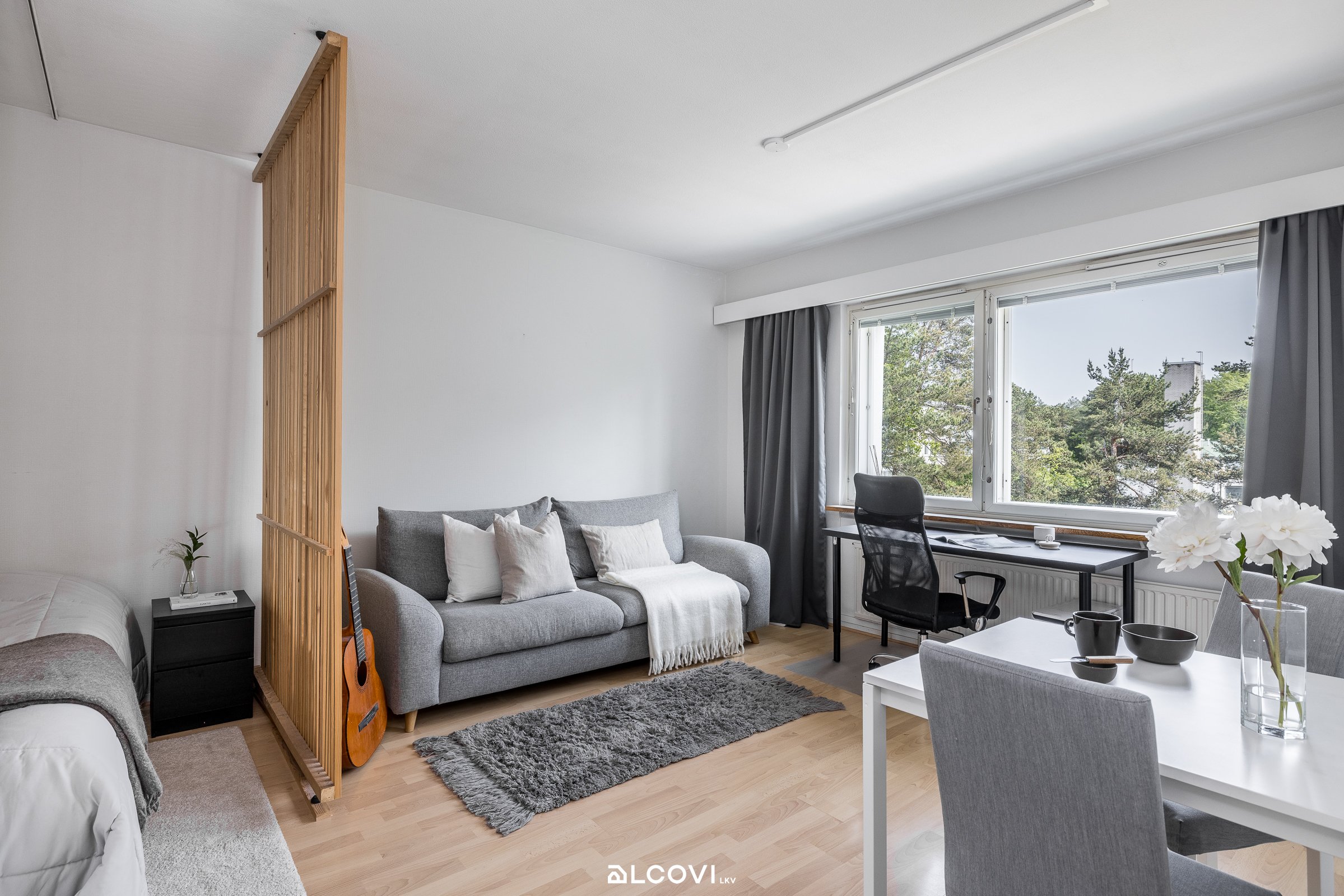 - Olo-/asuinhuoneen lattia on laminaattia, seinät maalatut. Makuutila erottuu olohuoneesta rimaseinämällä.