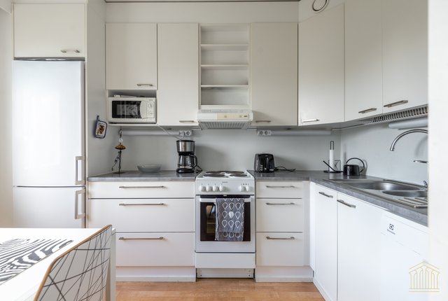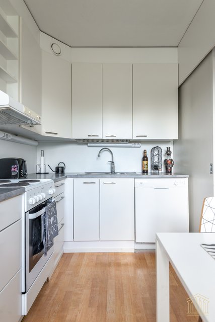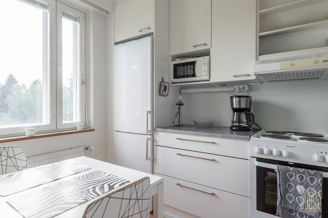 Keittokomero on hyvänkokoinen ja siinä on iso ikkuna. Kaapistot ovat Jokkis-keittiöiden käsialaa. Asunnossa on lisäksi makuuhuone ja vaatehuone