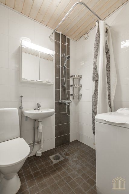 - WC-istuin, peilikaappi, pesukoneliitäntä, suihku, pesuallas, ja lattialämmitys