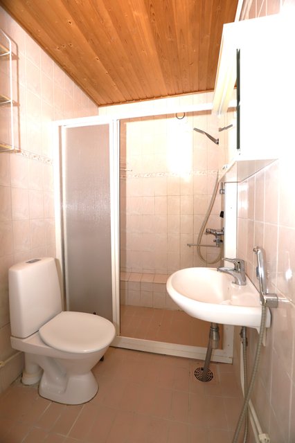 - Suihku, suihkuseinä, wc-istuin, peilikaappi, pesuallas, bidee-suihku, ja pesukoneliitäntä