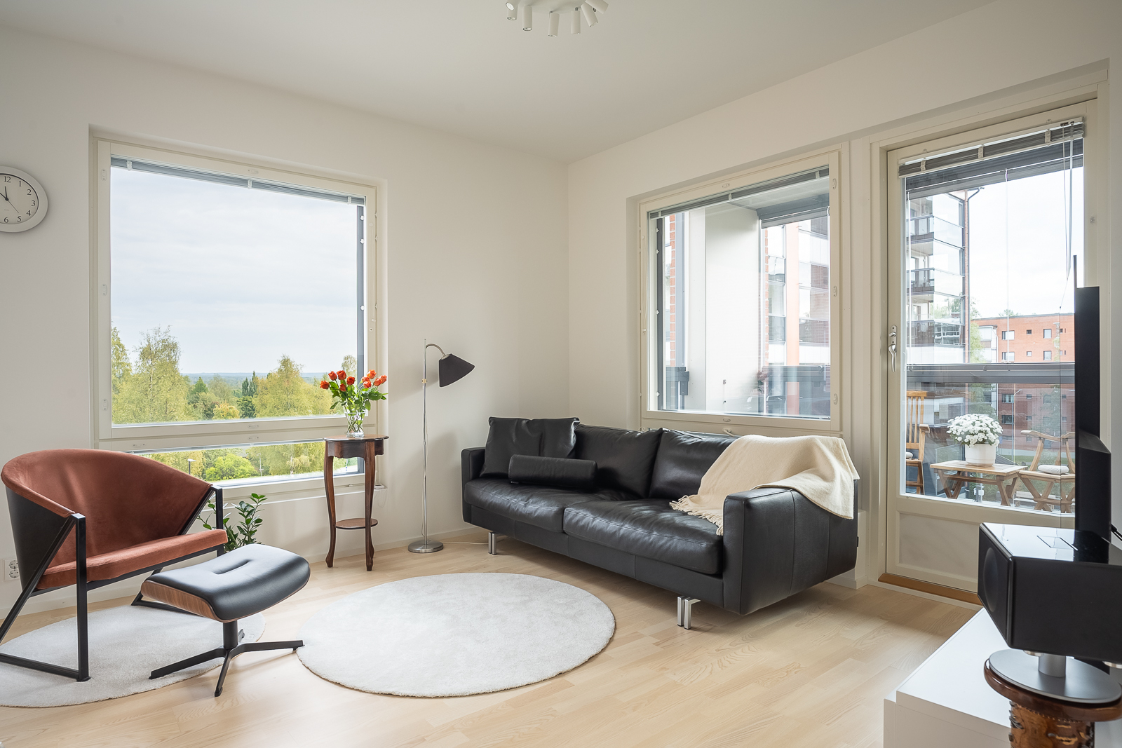 Tämä vaalein pintamateriaalein toteutettu asunto tarjoaa asukkaalleen selkeän pohjaratkaisunsa lisäksi tilavan kylpyhuoneen saunoineen ja pesukoneliitäntöineen sekä suuren lasitetun parvekkeen. Parvekkeelta upeat metsämäiset maisemat koilliseen/kaakkoon päin. Parvekkeen pitkällä sivulla laadukkaat Lumonin Visor-parvekekaihtimet (vekkiverhot). Keittiössä laadukkaat kodinkoneet (Asko, Siemens ja Bosch). Kaikki huoneiston kaapistot ovat Puustellia lukuun ottamatta kylpyhuoneen kalusteita. Lattiat ovat laadukasta ja kestävää Saarniparkettia. Saunassa on Harvian suosittu pilarikiuas ja laadukkaat tervaleppälauteet, seinät ja katto. Huoneiston viilennyksen hoitaa jo rakennusaikana asennettu Panasonicin viilennyspumppu.