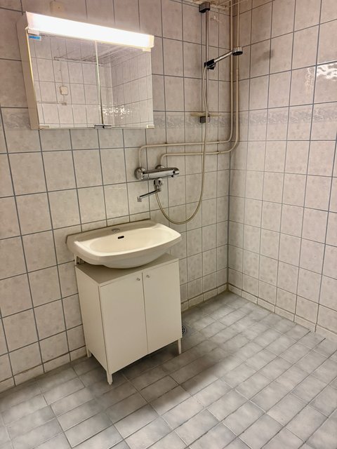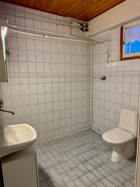 - WC-istuin, suihku, pesukoneliitäntä, peilikaappi, ja pesuallas