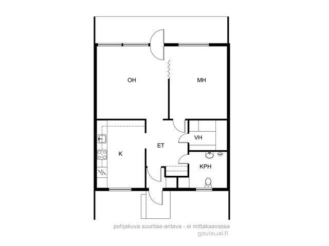 - Keittiö koilliseen. Olohuone ja makuuhuone lounaaseen, joista näkymät takapihalle ja metsikköön.