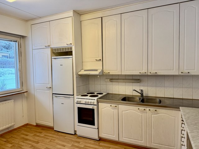 Keittiön ja olohuoneen lattiat ja seinäpinnat on uusittu vuonna 2024, mikä antaa tiloille raikkaan ilmeen. Keittiö on varustettu jääkaapilla, erillisellä pakastimella ja sähköliedellä, ja siellä on tilaa ruoanlaittoon. Kaapistosta löytyy myös hyvin säilytystilaa.