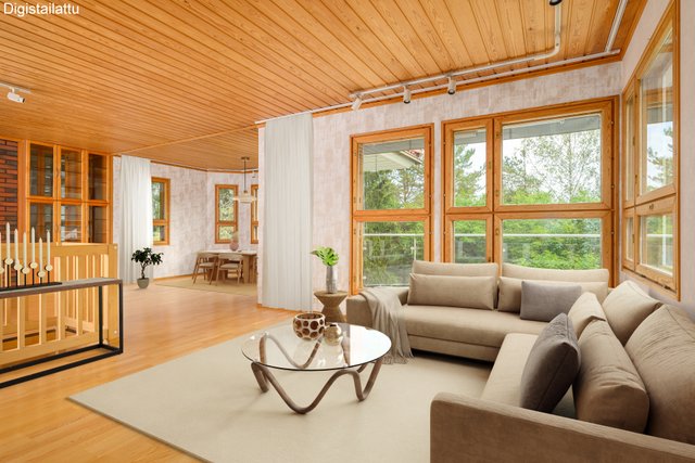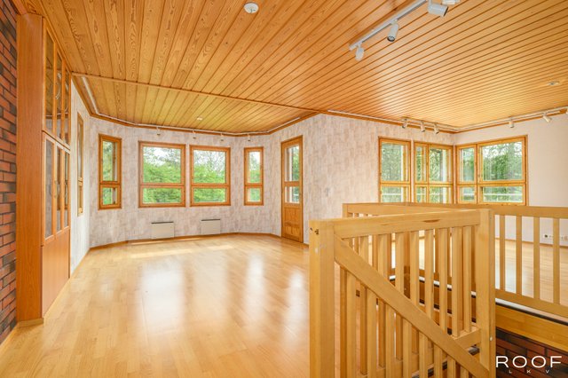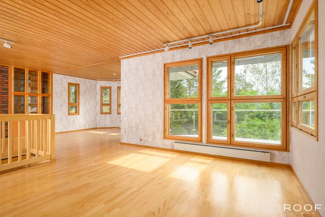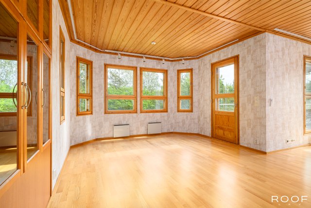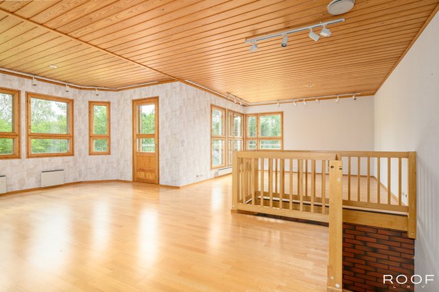 - Rakennuspiirustusten mukainen kerrosala on 220m², huoneistoala 165 m² ja muiden tilojen pinta-alat ovat; varasto 5 m² ja askarteluhuone 15,5m². Edellä mainitut pinta-alat saattaa tämän ikäisessä kohteessa poiketa olennaisestikin asuinrakennusten nykyisten mittaustapojen ja standardien mukaan laskettavasta asuintilojen pinta-alasta. Asuinrakennuksen todellinen asuinpinta-ala voi siis olla esitteessä mainittua pienempi tai suurempi. Ainoa tapa varmistua todellisista pinta-aloista on teettää pinta-alojen tarkistusmittaus. Kohteen hinta ei määräydy pinta-alan perusteella.