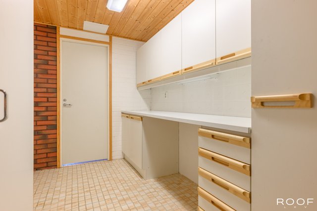 - Pesukoneliitäntä, lattiakaivo, tila pesutornille, pöytätaso, ja kaapistot, lämminvesivaraaja