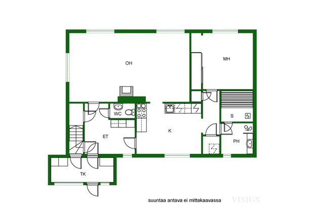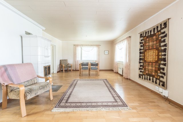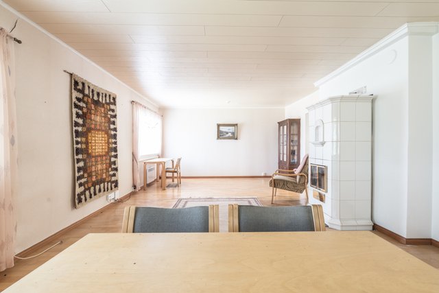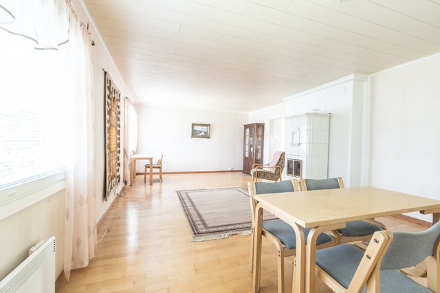 - Tilava olohuone, johon mahtuu myös ruokapöytä. Olohuoneessa on varaava takka. Olohuoneesta on mahdollisuus erottaa lisää makuuhuoneita.