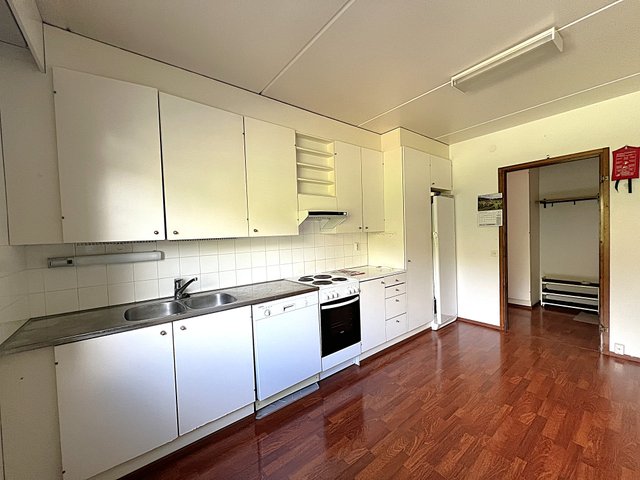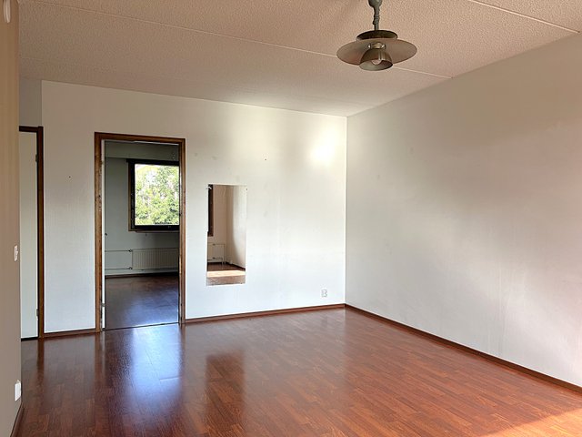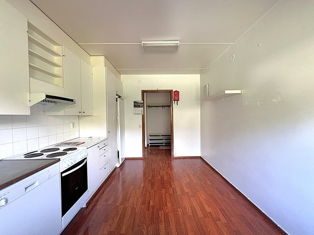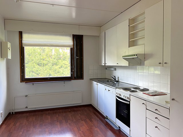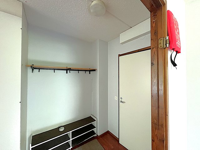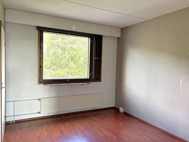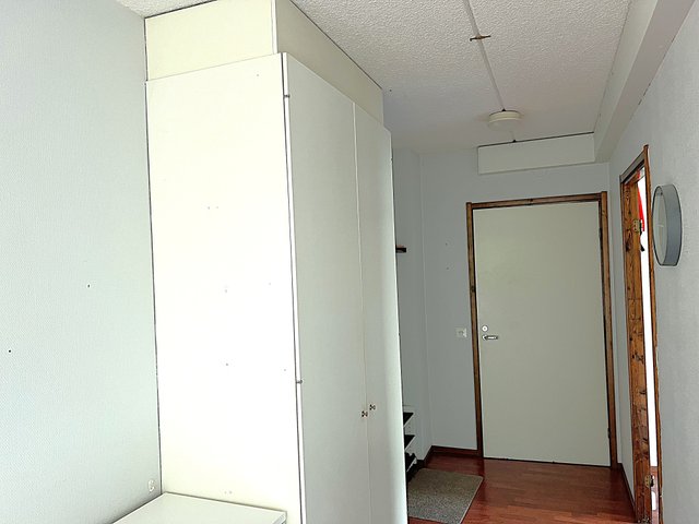 - Eteisessä vaatenaulakko ja siivouskomero sekä vaatekaappi, laminaattilattia, seinät lasikuitutapettia.