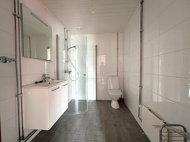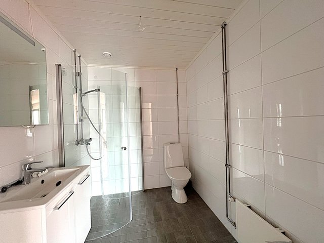 - WC-istuin, suihku, suihkuseinä, pesukoneliitäntä, pesuallas, allaskaappi, peili, ja bidee-suihku