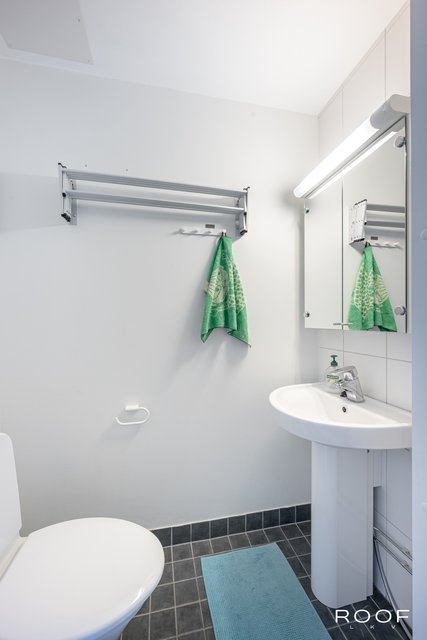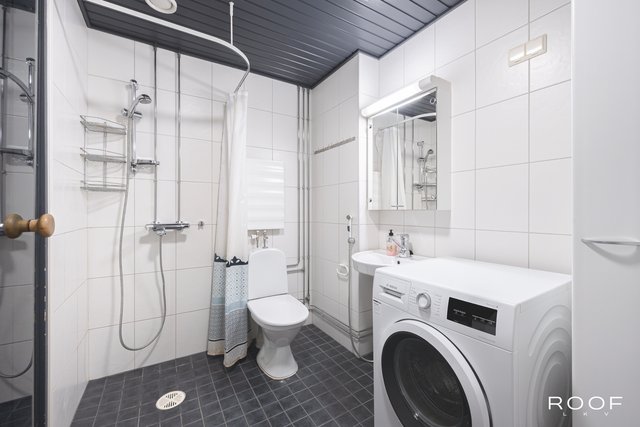 - WC-istuin, suihku, pesukoneliitäntä, pesuallas, peilikaappi, lattialämmitys, ja bidee-suihku