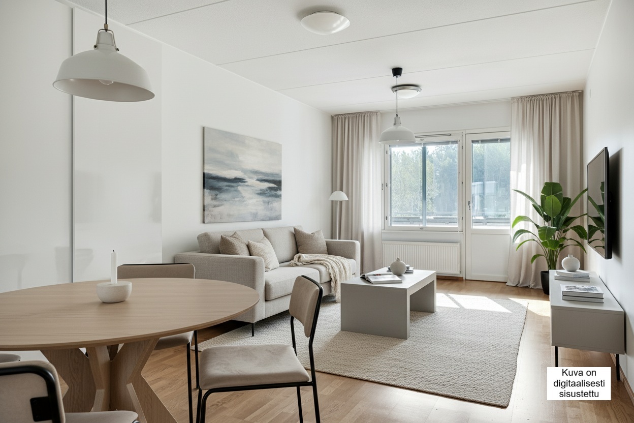 Tervetuloa tutustumaan tähän valoisaan ja toimivapohjaiseen kotiin, jossa arki sujuu mutkattomasti ja mukavasti. Kodissa avara olohuone, ruokailutila ja keittiö muodostavat yhtenäisen, toimivan tilan, jossa on helppo viihtyä niin arkena kuin viikonloppuna. Lasitettu, tilava parveke kutsuu nauttimaan aamukahvista tai iltahetkistä rauhaisissa maisemissa – näkymät avautuvat yhtiön vehreälle, hyvin hoidetulle pihalle. Asunnossa on kaksi makuuhuonetta, joista toisen yhteydessä on reilunkokoinen vaatehuone. Tilavaan kylpyhuoneeseen mahtuu pesutorni ja erittäin siisti sauna viimeistelee viihtyisän kodin. Erillinen wc lisää arjen toimivuutta.