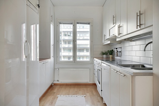 - Valkoiset keittiökalusteet, tasot laminaattia, välitila laattaa. Kodinkoneet: jääkaappi, pakastin, liesi, liesituuletin, astianpesukone.