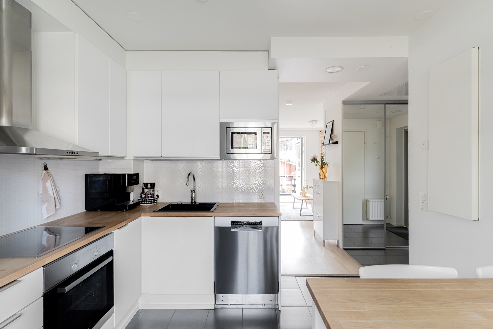 - Astianpesukone, erillisuuni, jääkaappi, mikroaaltouuni, erillinen pakastin, liesituuletin, ja kiinteät valaisimet, liesitaso