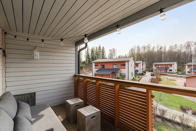 Alakerrassa on tilava olohuone, josta on käynti lasitetulle terassille, alakerrasta löytyy myös hyvin varusteltu keittiö ja tilava kylpyhuone. Lasitetulla terassilla voit nauttia niin varhaisesta keväästä kuin pimenevistä illoistakin. Terassilta on käynti omalle piha-alueelle. Sauna pesuhuoneineen sekä molemmat makuuhuoneet sijaitsevat talon yläkerrassa, joista toisen yhteydessä on tilava, länteen avautuva parveke. Asunnon edessä on paikat kahdelle autolle.