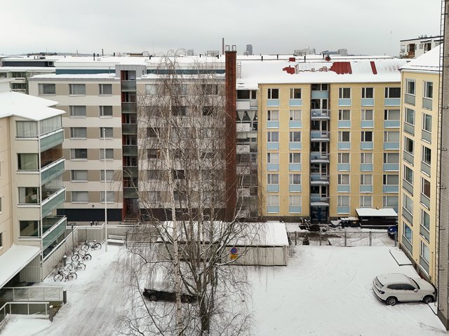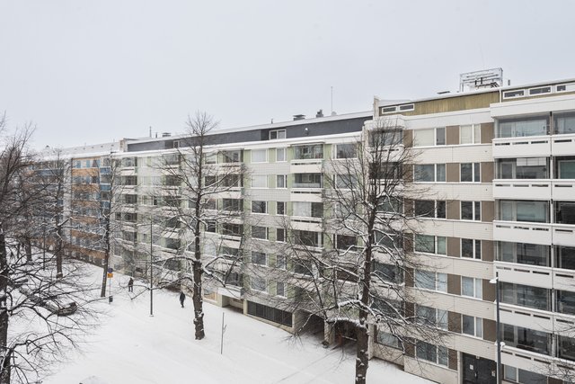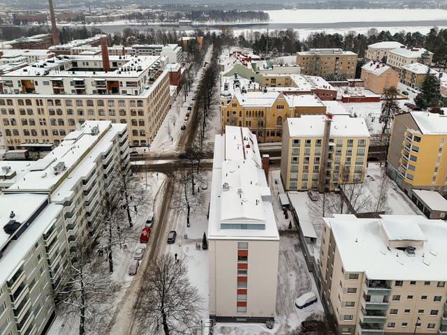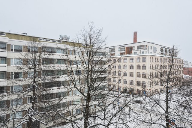 - Avarat kaupunkinäkymät olohuoneesta, keittiöstä ja makuuhuoneesta Koulukadulle, toinen makuuhuone on suojaisalle sisäpihalle.