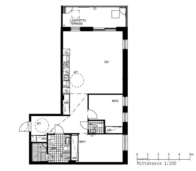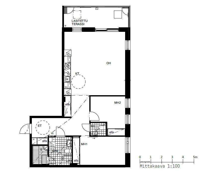 Tässä 1. kerroksen (ei maan tasalla) valoisassa avarassa kolmiossa on hyvät puitteet monenlaiseen asumiseen. Kaksi tilavaa makuuhuonetta, joissa molemmissa on kiintokaapistot. Erittäin tilava oleskelutila, jossa on yhdessä laadukas ja tyylikäs keittiö sekä erittäin valoisa olohuone, tarjoaa tilaa sekä arkeen että juhlaan. Olohuoneesta on kulku isolle lasitetulle parvekkeelle, joka toimii tilan jatkeena lähes vuoden ympäri. Asunnossa on lisäksi tyylikäs kylpyhuone omalla saunalla, sekä erillinen wc.