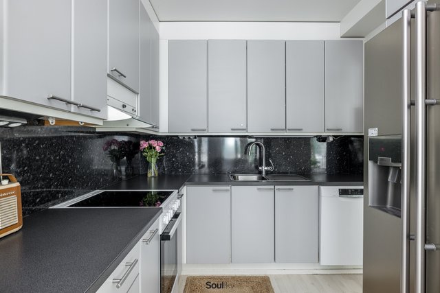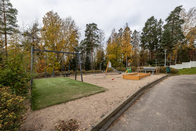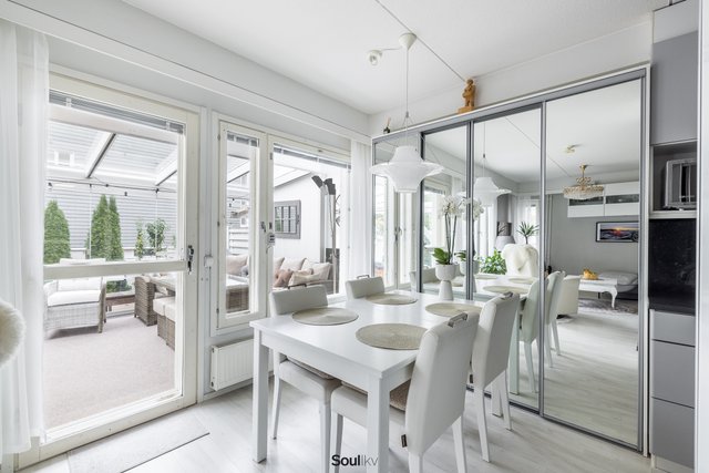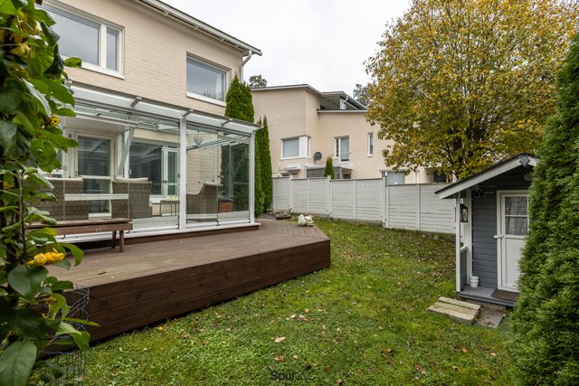Keittiö on käytännöllinen ja hyvin varusteltu. Kaappitilaa on runsaasti ja sen vieressä on luonnollinen paikka ruokailuryhmälle. Avoin yhteys olohuoneeseen lisää tilantuntua. Olohuone on tilava ja helposti kalustettavissa. Se jatkuu lasitetulle terassille ja suurelle aidatulle pihalle. Pihalla on tilaa niin leikeille kuin oleskelullekin, ja sieltä löytyy myös soma leikkimökki.