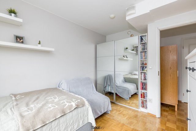 Yläkerrassa sijaitsevat kaksi makuuhuonetta sekä uusittu kylpyhuone saunoineen. Lisäksi yläkerrasta löytyy lasitettu parveke. Yläkerran mosaiikkiparkettilattiat vaativat hiomisen, mutta ne saa pienellä vaivalla kunnostettua kauniisti esiin.