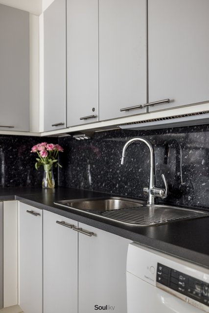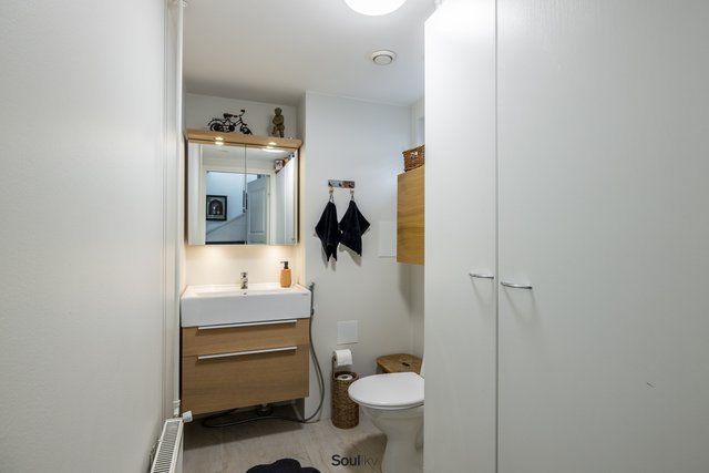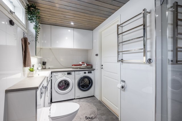 - WC-istuin, suihku, pesukoneliitäntä, lattialämmitys, peilikaappi, allaskaappi, ja bidee-suihku