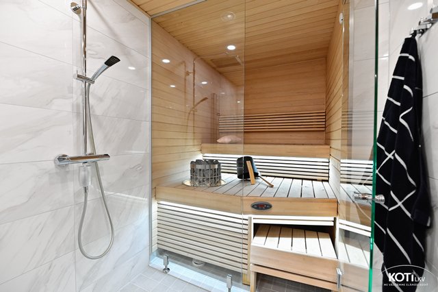 - Upea vuonna 2021 uusittu sauna lasiseinällä ja pilarikiukaalla.