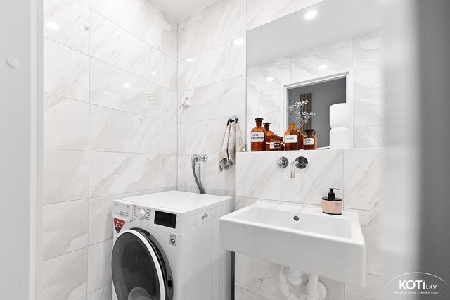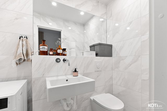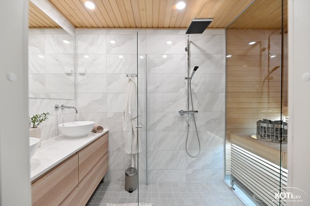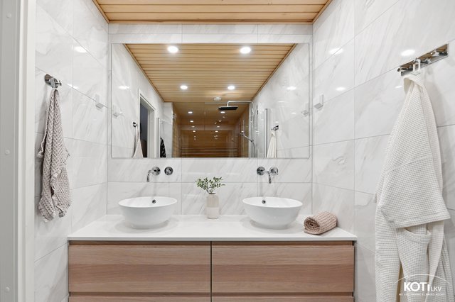 - Lattialämmitys, suihku, suihkuseinä, allaskaappi (x 2), peili, ja pesuallas (x 2)