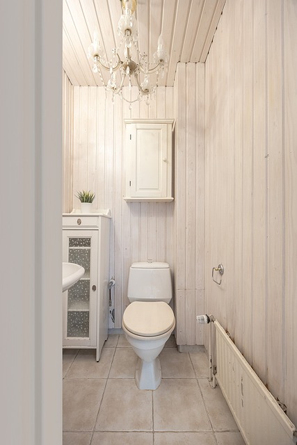 - Erillinen wc sisääntulokerroksessa. Allas, seinäkaappi, puolikorkea kaappi, wc-istuin, seinälampetit x 2.
