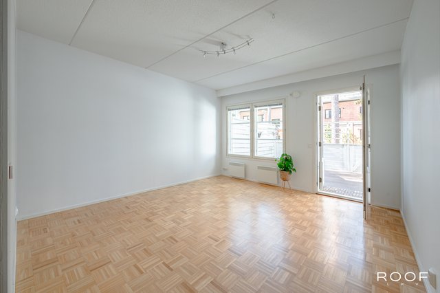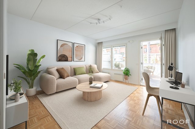 - Olohuoneesta on käynti terassille. SEINÄT: maalattu tapetti. LATTIA: parketti.