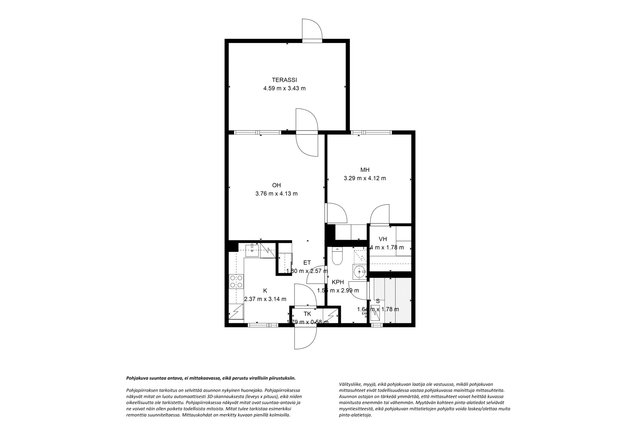 - Isännöitsijäntodistuksen mukainen, Yhtiöjärjestyksen mukainen, (Pinta-ala ei ole tarkistusmitattu ja todellinen pinta-ala voi olla suurempi tai pienempi, kuin ilmoitettu)