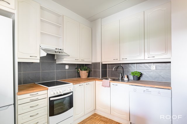 - Keittiön varusteisiin kuuluu: jääkaappi/pakastin (uusi), sähköliesi (Rosenlew), liesituuletin (hormi), astianpesukone (Bosch) TYÖTASO: laminaatti, VÄLITILA: laatoitettu, SEINÄT: maalattu, LATTIA: parketti.