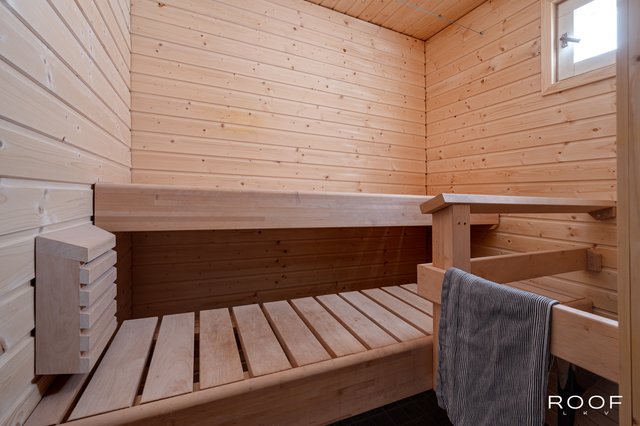 - Oma, ikkunallinen sauna lämpiää sähkökiukaalla. SEINÄT: puupaneeli. LATTIA: laatta.