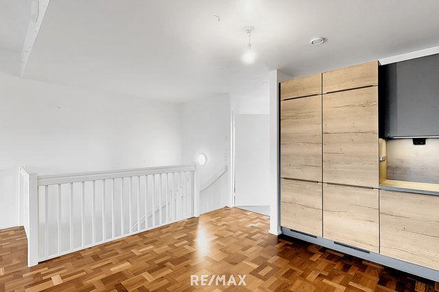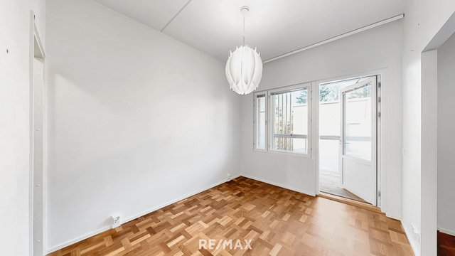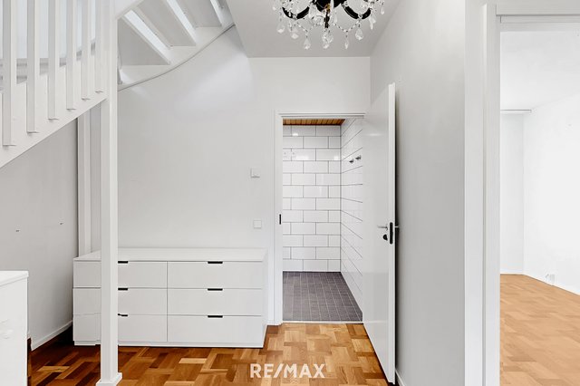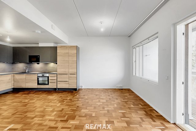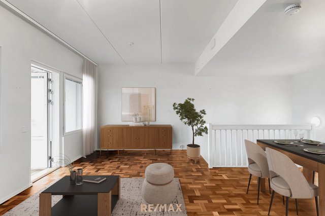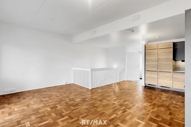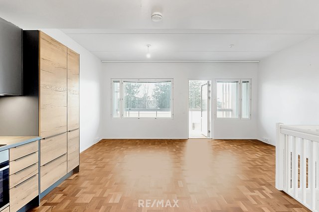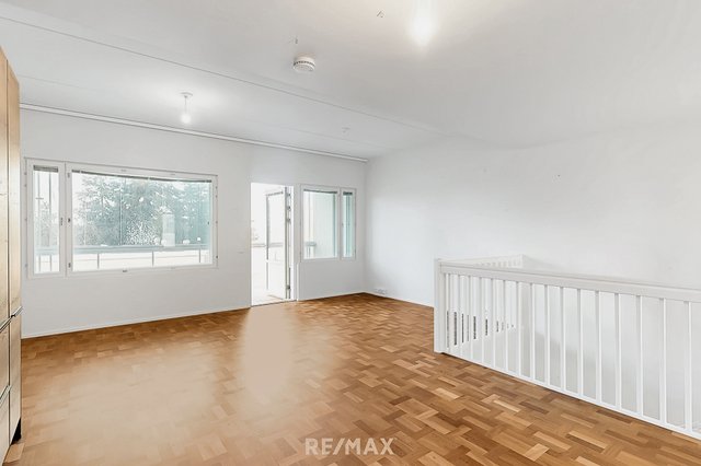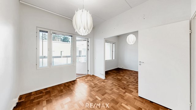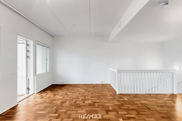 - Tilava ja valoisa olohuone. Olohuoneen huonekorkeus vaihtelee 2,52–2,93 metriä, mikä tuo avaruutta ja ilmavuutta tilaan. Seinät on maalattu ja lattia on kaunista parkettia. Olohuoneesta avautuu käynti koko huoneiston levyiselle lasitetulle parvekkeelle.