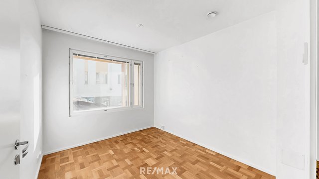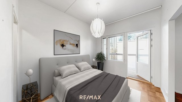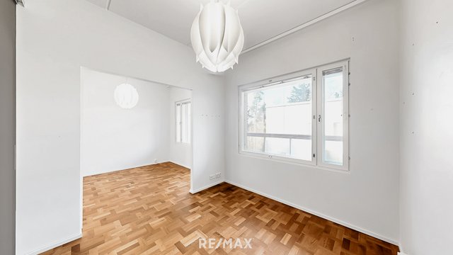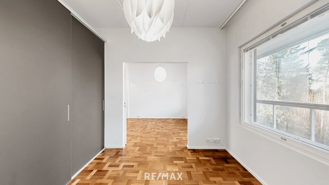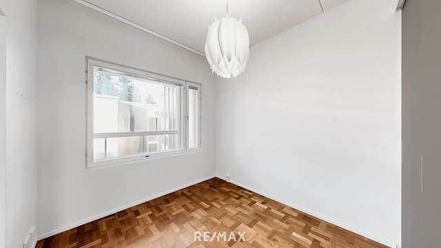 - Asunnossa on kolme hyvänkokoista makuuhuonetta. Lattiamateriaalina on parketti ja seinät on maalattu. Kaksi makuuhuonetta on yhdistetty poistamalla osa väliseinästä, mutta palauttaminen erillisiksi huoneiksi on rakenteellisesti helposti tehtävissä.