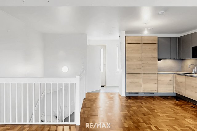 Sisääntulokerroksessa avautuu tilava eteinen, moderni kylpyhuone sekä olohuoneen ja avokeittiön yhdistelmä. Reilu huonekorkeus, suuret ikkunat ja lasitettu parveke tuovat runsaasti valoa ja tilantuntua. Kodin yläkerta muodostaa viihtyisän keskuksen yhteiselle arjelle ja sosiaaliselle elämälle – siellä sijaitsevat kaikki tärkeimmät toiminnot yhdessäoloon ja viihtymiseen.