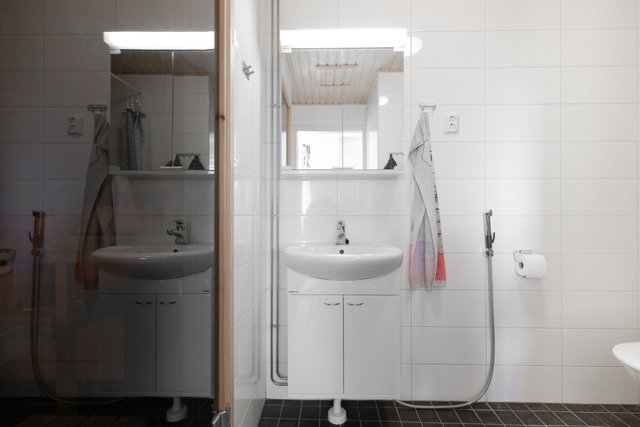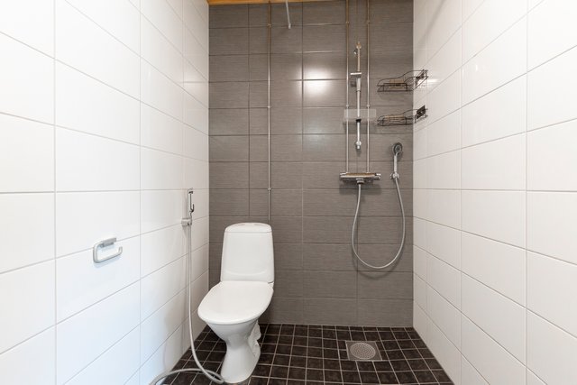 - WC-istuin, suihku, pesukoneliitäntä, peilikaappi, bidee-suihku, allaskaappi, ja pesuallas
