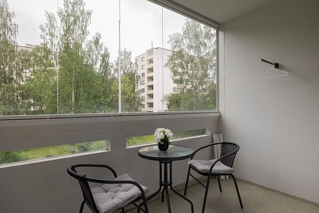 Tilava lasitettu parveke aukeaa sisäpihalle, länteen.