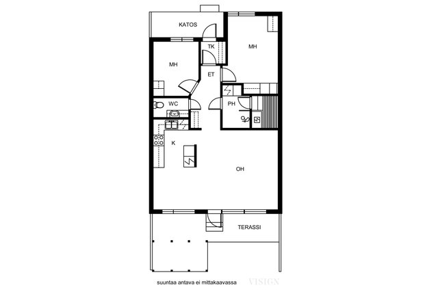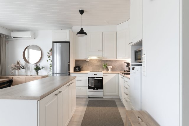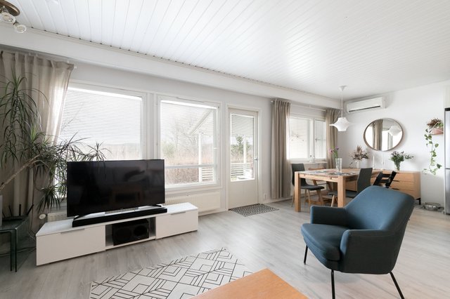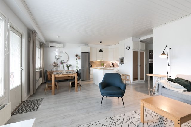 Asunnossa on tilava olohuone, jossa luonnonvalo tulvii sisään suurista ikkunoista. Keittiö on varusteltu nykyaikaisilla kodinkoneilla, kuten induktioliedellä ja astianpesukoneella, mikä tekee arjesta sujuvaa. Kylpyhuoneessa on mukavuutta lisäävä lattialämmitys, ja oma sauna tarjoaa rentouttavia hetkiä pitkän päivän päätteeksi.